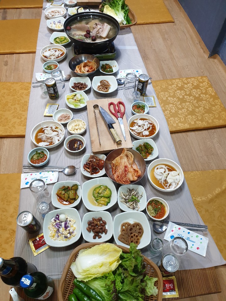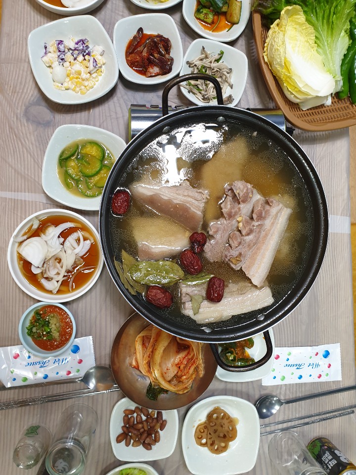 저기 도마위에 있는 집게로 수육을 건져서, 칼로 적당히 썰어서 먹으면 되요..