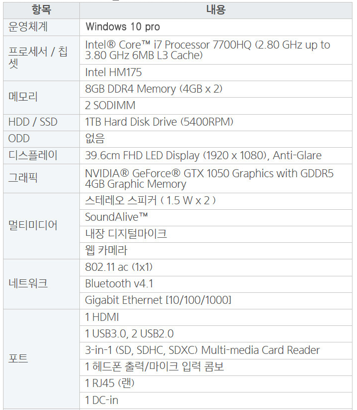 제가 이번에 산 오디세이 노트북은 i7 7세대 모델이에요, 8세대도 나와 있지만 가격 차이가 좀 나서 7세대로 구매하게 되었어요. OS는 윈도우10이구요, 램 8G, 기본 1T HDD에 250G SSD를 추가장착한 모델이라고 하네요.