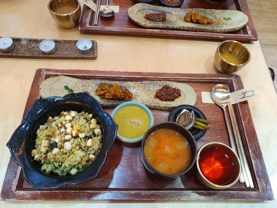 탐복밥(곤드레)에요. 가자미 양념장이랑 비벼 먹으면 되구요, 간이 조금 약하다 싶으면 전복 내장 양념장을 같이 비벼서 먹으면 될듯해요.. 저는 전복 내장 양념장을 같이 비벼먹는게 더 맛있더라구요.. 양은 여자가 먹으면 충분한데, 남자가 먹으면 살짝 아쉬울수도 있을거 같아요.. 사람마다 다르겠지만요..ㅎㅎ
