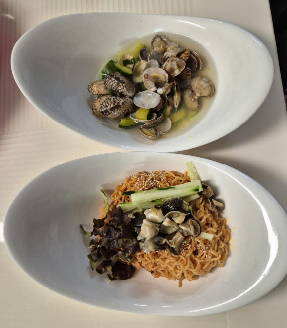 쨔잔~ 완성된 조개탕과 골뱅이 비빔면이에요~ ^^